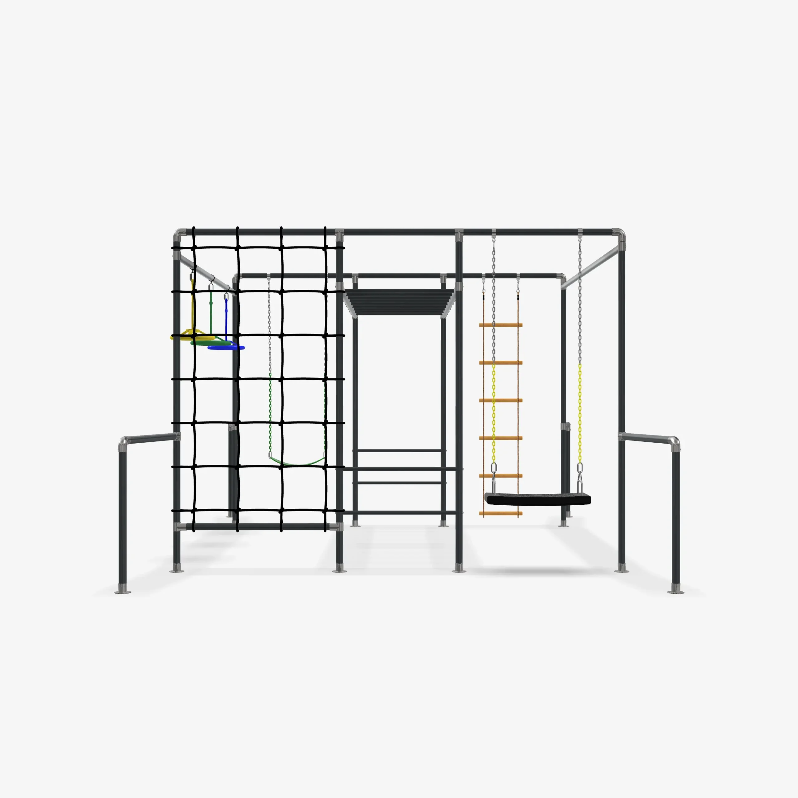 Ausgestattet mit drei nutzbaren Schaukelfeldern, beinhaltet das Gerüst eine drei Ninja Wheels, eine Schaukel, eine Strickleiter und ein Trapez. So können die einen im kleinen Netz klettern, während andere entspannt schaukeln oder ihre Kraft und Geschicklichkeit am Trapez und den Ninja Wheels testen.