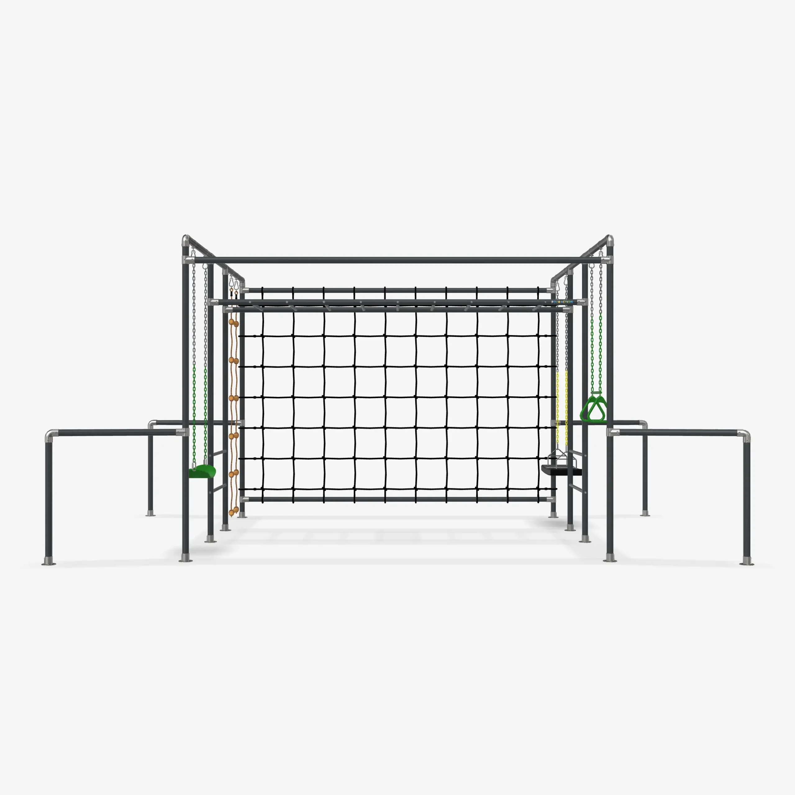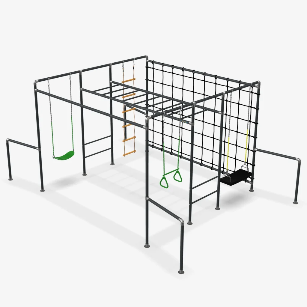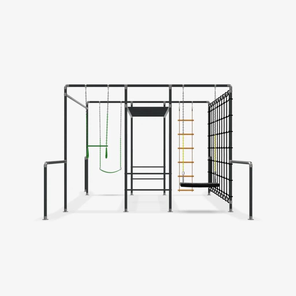 Ausgestattet mit vier nutzbaren Schaukelfeldern, beinhaltet das Gerüst zwei Schaukeln, eine Strickleiter und ein Trapez. So können die einen im großen Netz klettern, während andere entspannt schaukeln oder ihre Kraft und Geschicklichkeit am Trapez testen.