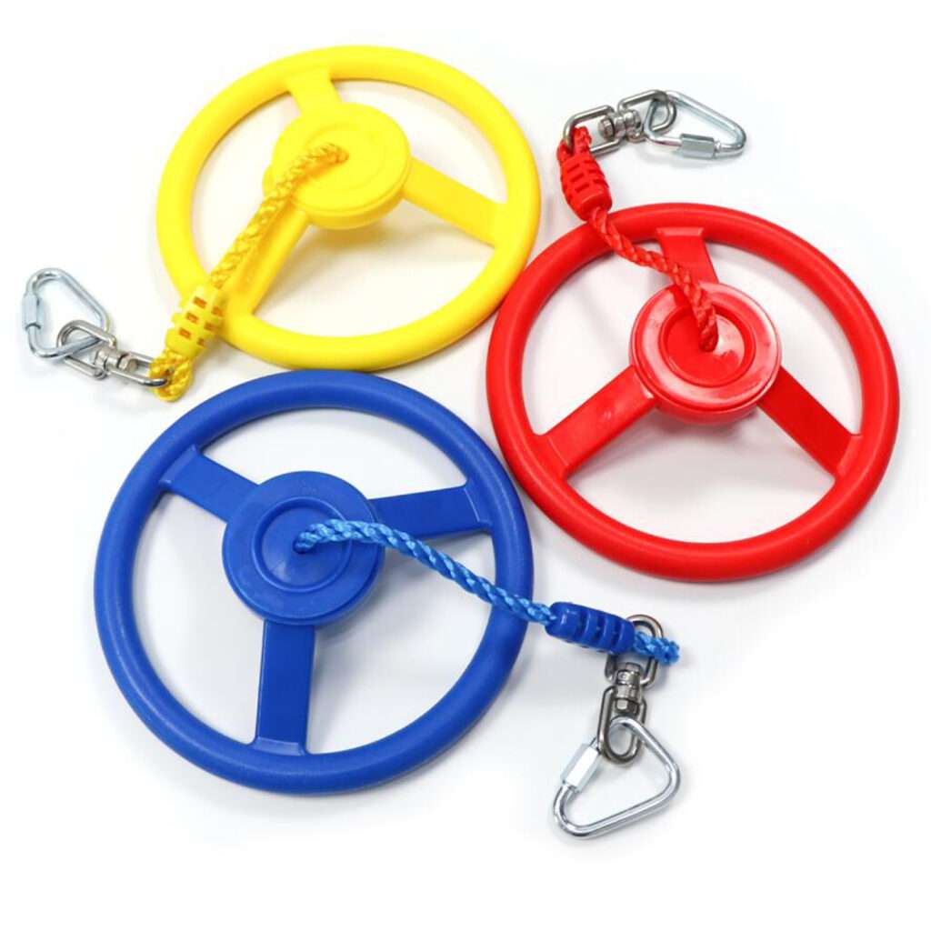 Ninja Wheel aus Kunststoff, das als zusätzliches Hindernis an deinem FOURACTION Klettergerüst für noch mehr Abwechslung sorgt.  Besonders beliebt bei den Kindern ist das Ninja Wheel, weil man sich herrlich um die eigenen Achse drehen kann.