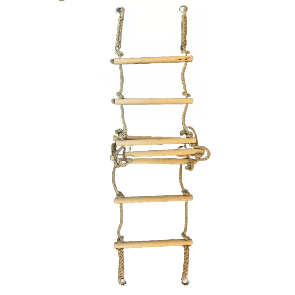 Massive Strickleiter 3 Meter Die Seile der Strickleiter sind witterungsbeständige Kunsthanfseile mit einem Durchmesser von 12 mm. Die Sprossen bestehen aus Buchenholz mit ca. 3 cm Durchmesser und einer Länge von 43 cm. Auf einen Meter werden 3 Sprossen eingearbeitet. Die Sprossen sind mit Klarlack trommellackiert, dadurch kann die Strickleiter auch ohne Probleme im Außenbereich hängen bleiben. Die Strickleiter ist sehr massiv gebaut und auch für Erwachsene geeignet. Bruchlast: 150 kg