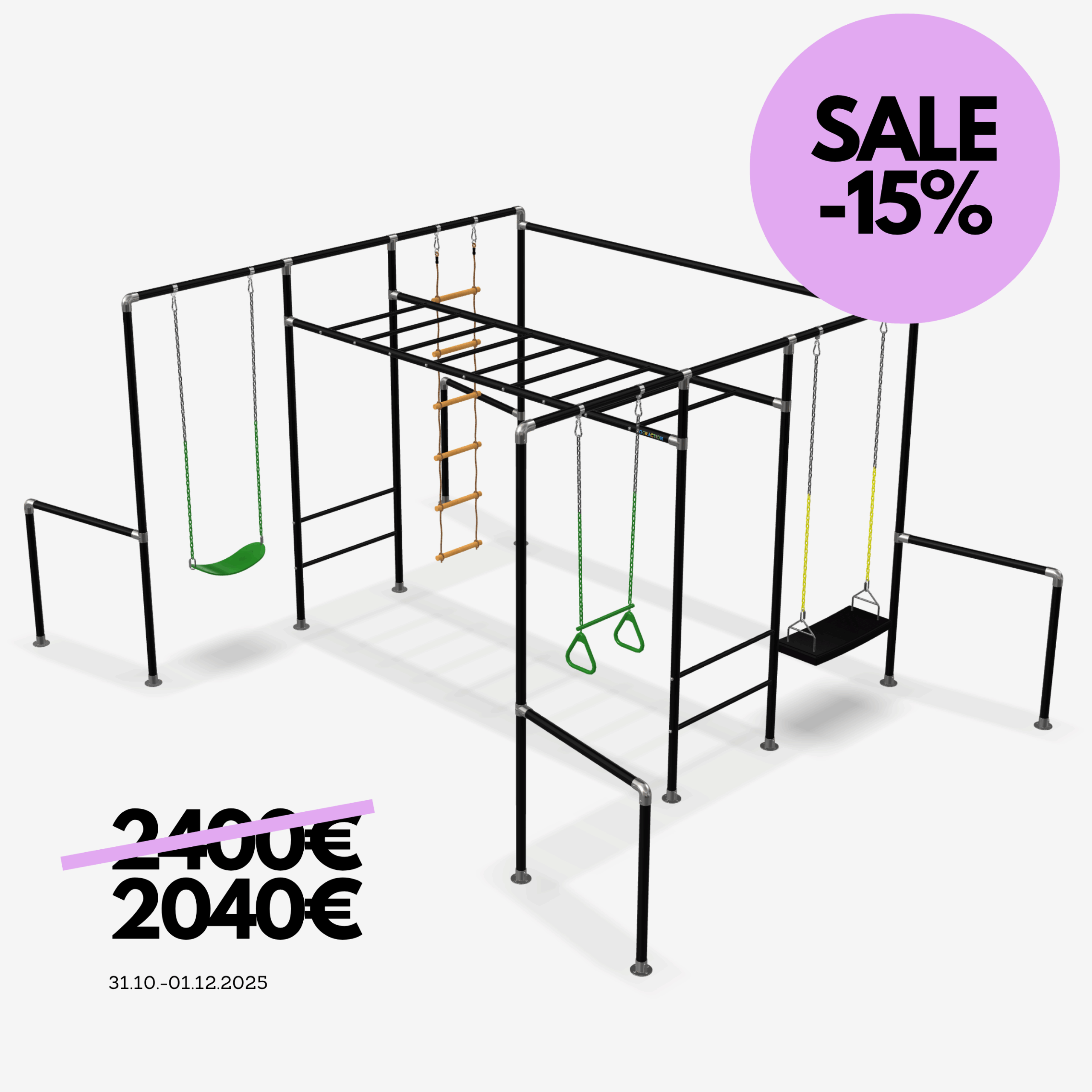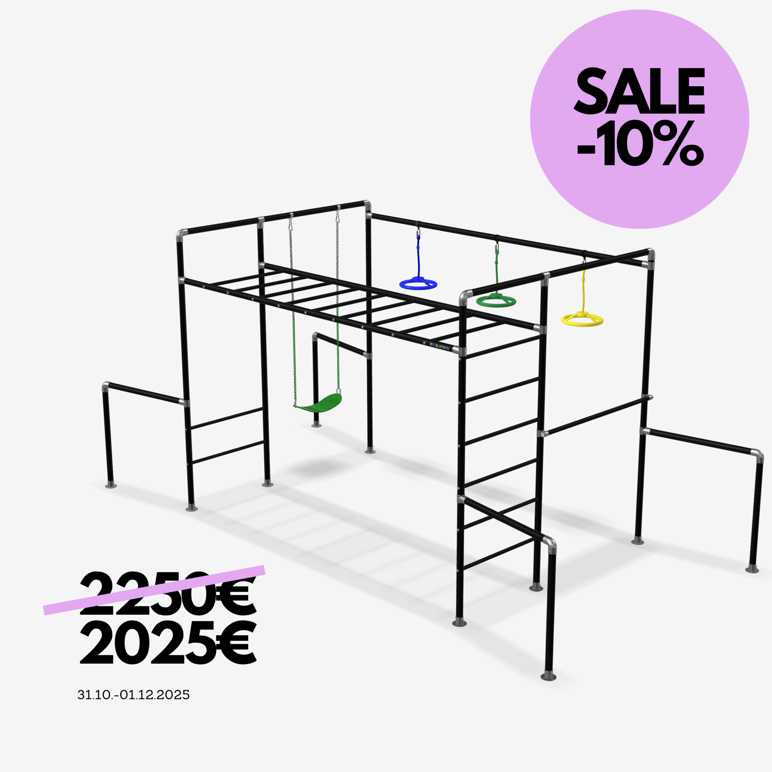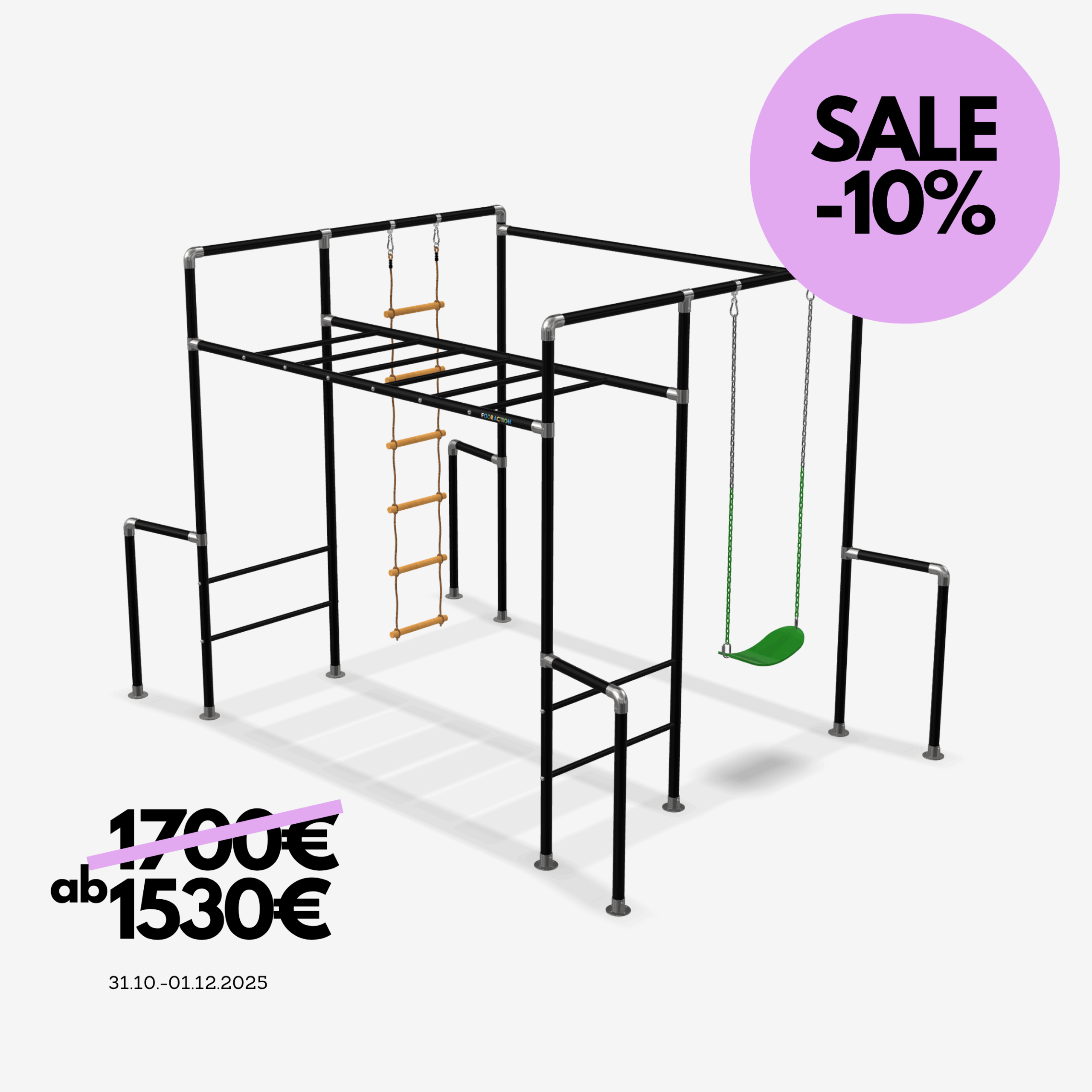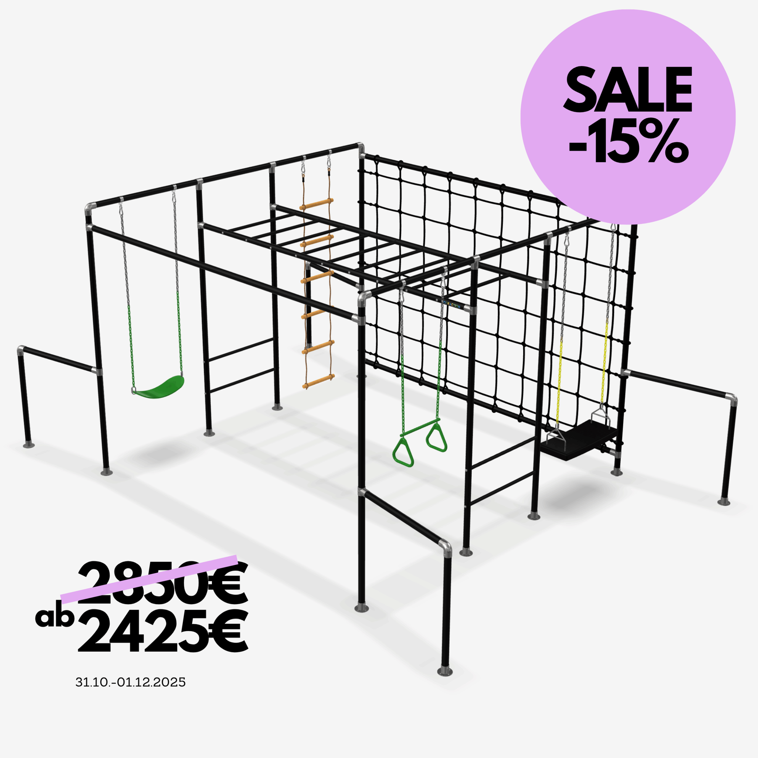 Hergestellt in Europa, aus robusten, pulverbeschichteten Stahlrohren, benötigen unsere Klettergerüste kein Betonfundament, was die Installation erleichtert und mehr Flexibilität für die Standortwahl bietet. Sie bieten ein sicheres und vielseitiges Spielumfeld, das mit Ihren Kindern mitwächst. Hier können Kinder schaukeln, toben, hangeln oder einfach gemütlich abhängen – unsere Klettergerüste bleiben über die gesamte Kindheit hinweg attraktiv und fördern gleichzeitig die motorischen Fähigkeiten.
