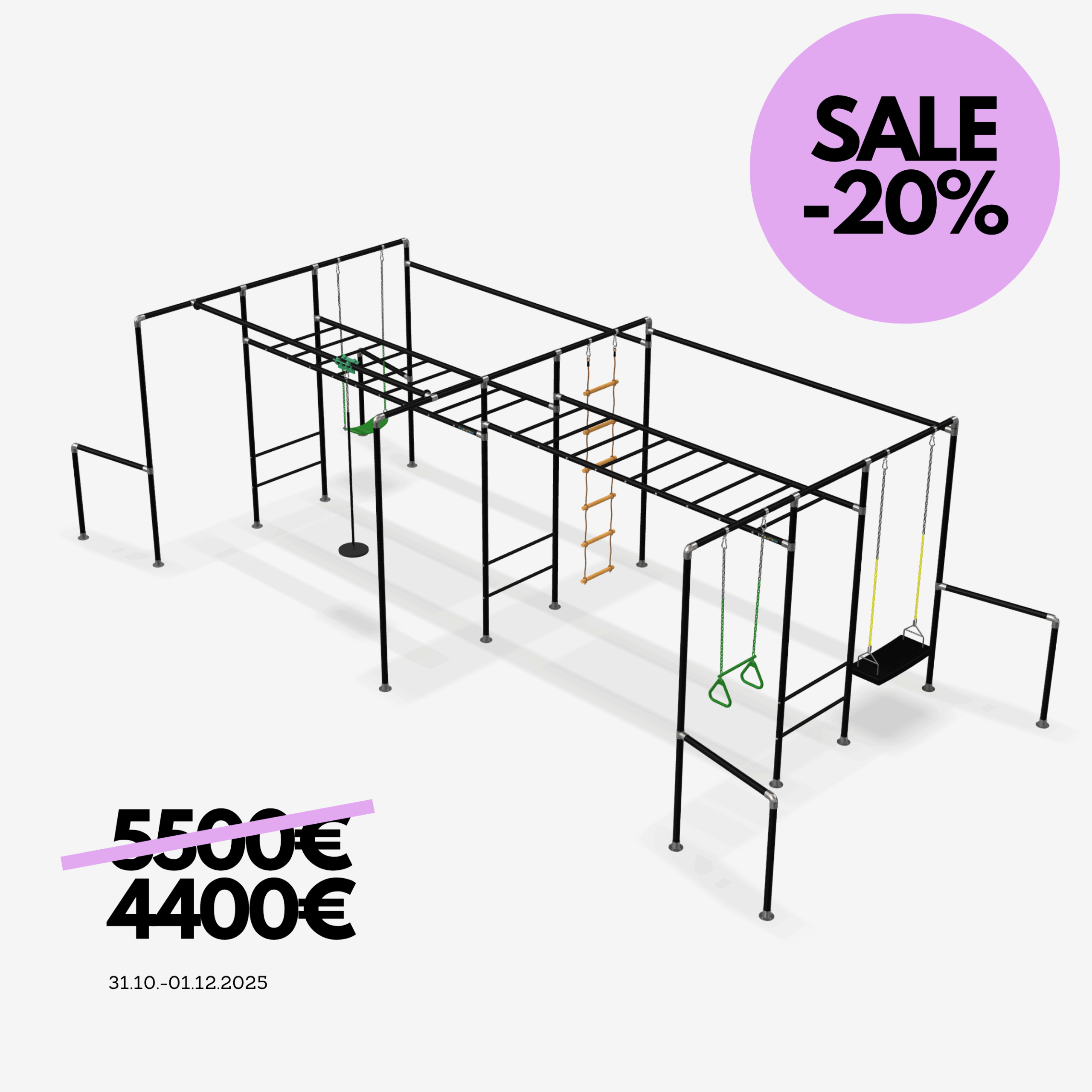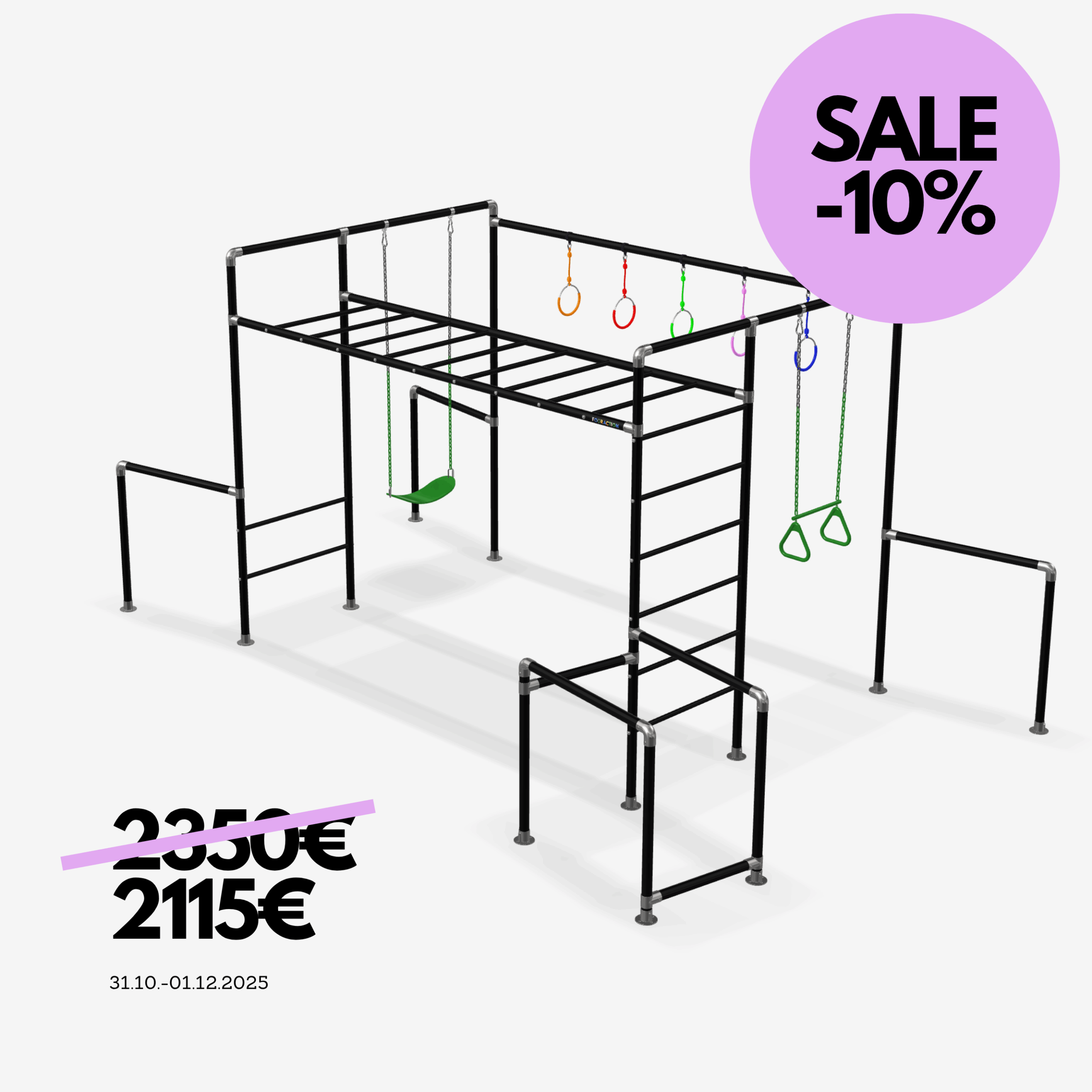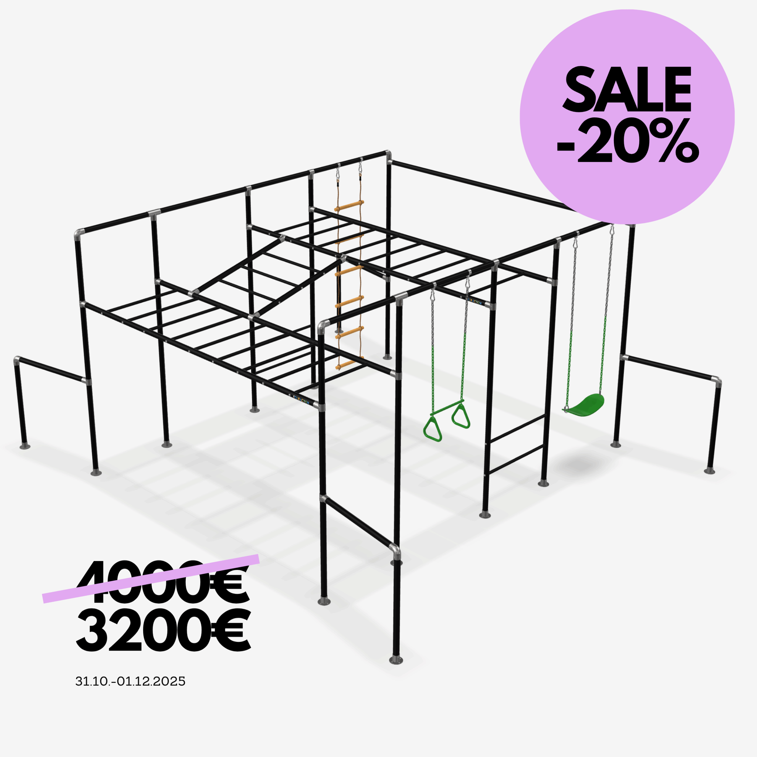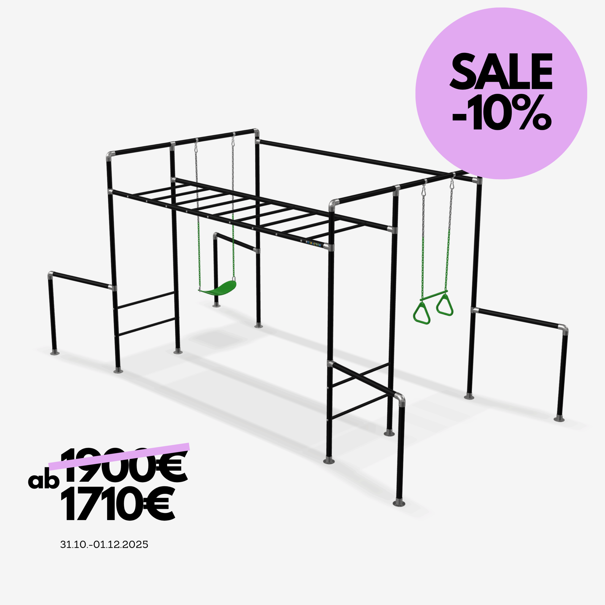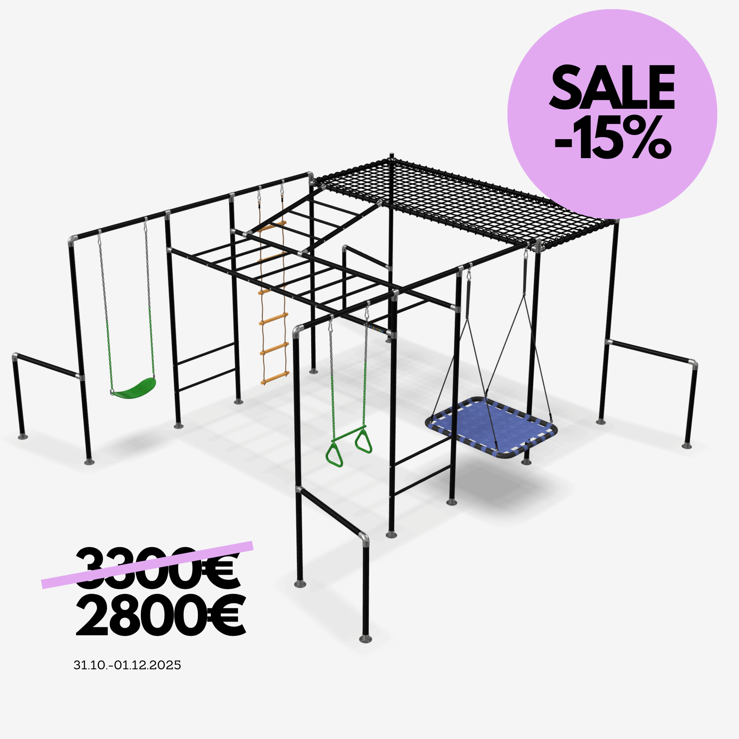 Hergestellt in Europa, aus robusten, pulverbeschichteten Stahlrohren, benötigen unsere Klettergerüste kein Betonfundament, was die Installation erleichtert und mehr Flexibilität für die Standortwahl bietet. Sie bieten ein sicheres und vielseitiges Spielumfeld, das mit Ihren Kindern mitwächst. Hier können Kinder schaukeln, toben, hangeln oder einfach gemütlich abhängen – unsere Klettergerüste bleiben über die gesamte Kindheit hinweg attraktiv und fördern gleichzeitig die motorischen Fähigkeiten.